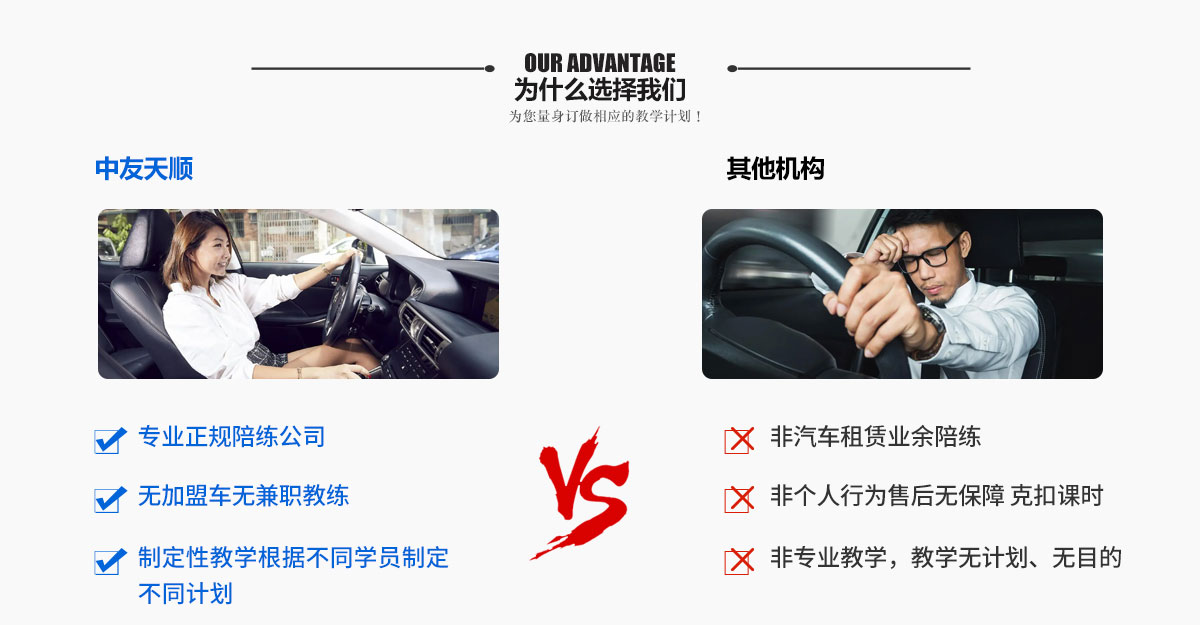 北京中友天順汽車陪練隸屬于北京中友天順汽車技術(shù)有限公司一家專業(yè)的汽車陪練公司,公司秉承宗旨:為已有駕駛本而不能夠在實際道路上安全行駛的駕駛員而服務(wù)的,我們大力宣揚道路安全駕駛理念,深度提高駕駛員駕駛技術(shù),為首都駕駛員的安全駕駛技術(shù)和安全駕駛意識服務(wù).從而減少首都道路的涌堵,減少首都交通事故的發(fā)生。針對不同開車基礎(chǔ)的學(xué)員制定各種培訓(xùn)方案!誠信、專業(yè)、周到!北京中友天順汽車陪練公司全部為部隊轉(zhuǎn)業(yè)軍人,駕齡都在十五年以上,